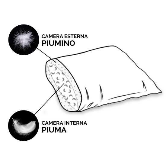 Ο πρώτος είναι επενδυμένος από 100% πολύ μαλακό πούπουλο χήνας από τις ιταλικές Άλπεις, ενώ ο δεύτερος, ο οποίος είναι ο κεντρικός πυρήνας του μαξιλαριού, αποτελείται από 30% πούπουλο χήνας και 70% μικρό φτεράκι χήνας.
